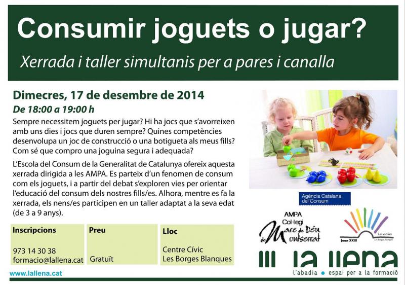 Les festes de Nadal i Reis són especials per a tothom però especialment per a la canalla. Els hàbits de joc han canviat molt i molts pares i mares d'avui es plantegen quina és la millor manera i la forma més constructiva d'aprofitar els regals de Nadal i Reixos. Amb la col.laboració de les AMPA del Col.legi Joan XXIII i del Col.legi Nostra Sra. de Montserrat, la Llena i l'Agència Catalana del Consum organitzen un taller pràctic per als pares i, simultàniament per als infants de 3 a 9 anys, on es tractaran tots aquests temes i dilemes d'una manera pràctica i aplicada. El taller té una 75 minuts de durada i serà a partir de les 18.00 hores del dimecres 17 de desembre al Centre Cívic de les Borges, en dos espais separats, i amb sengles experts, un pels pares i un per la canalla.
