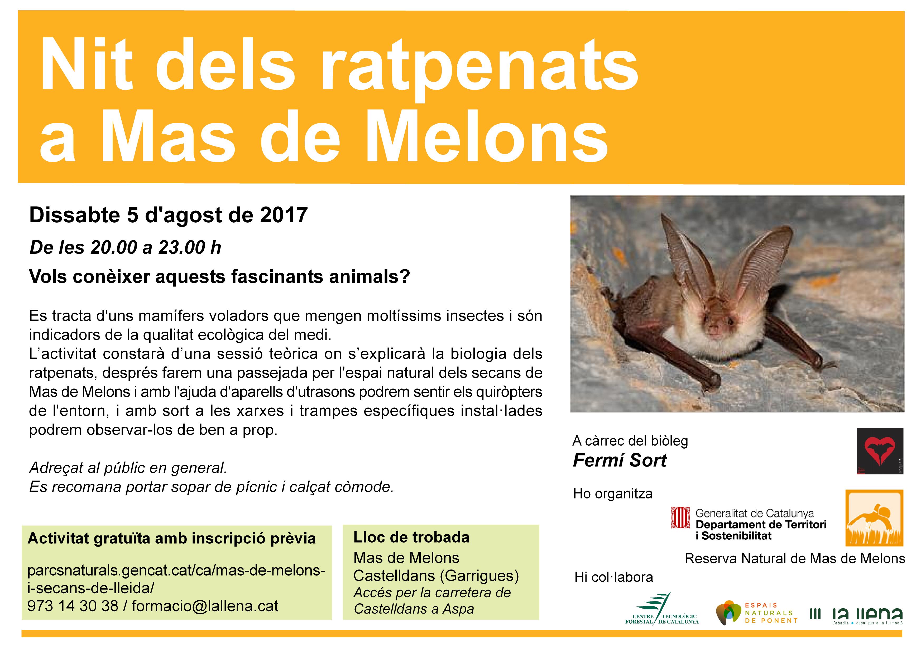 L’activitat constarà d’una sessió teòrica on s’explicarà la biologia dels ratpenats, després farem una passejada per l'espai natural dels secans de Mas de Melons i amb l'ajuda d'aparells d'utrasons podrem sentir els quiròpters de l'entorn, i amb sort a les xarxes i trampes específiques instal·lades podrem observar-los de ben a prop.