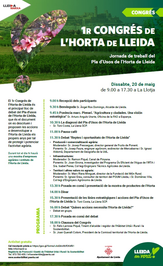 El 20 de maig de 2017 es va celebrar a la Llotja de Lleida el Congrés de l’Horta de Lleida, en aquesta jornada hi van participar més de 150 persones que varen debatre sobre les actuacions a fer a l’Horta en els pròxims anys.