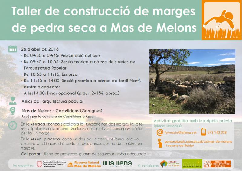 El 28 d'abril de 09:30 a 14:00 es realitzarà un taller de construcció de marges de pedra seca a Mas de Melons.